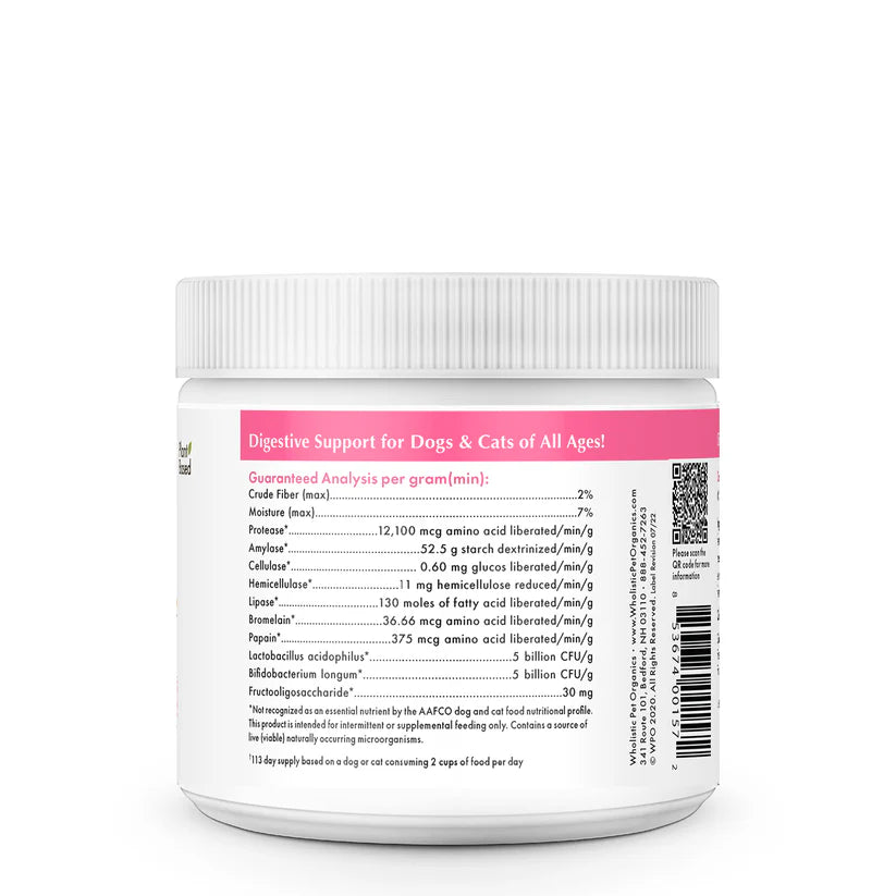 Of the three major classes of enzymes, digestive enzymes are responsible for breaking down food into its constituent nutrients for the body to utilize. Different enzymes break down different foods. When enzyme stores are low, it is harder for the digestive system to break down fats, protein, and carbohydrates. Poor digestion can cause pets to suffer from constipation, diarrhea, flatulence, and more. Wholistic Digest-All Plus™ is a unique enzyme blend of pure, freeze-dried, plant, and plant-based enzymes with added maximum concentrations of prebiotics and probiotics. Formulated for maximum digestive support!